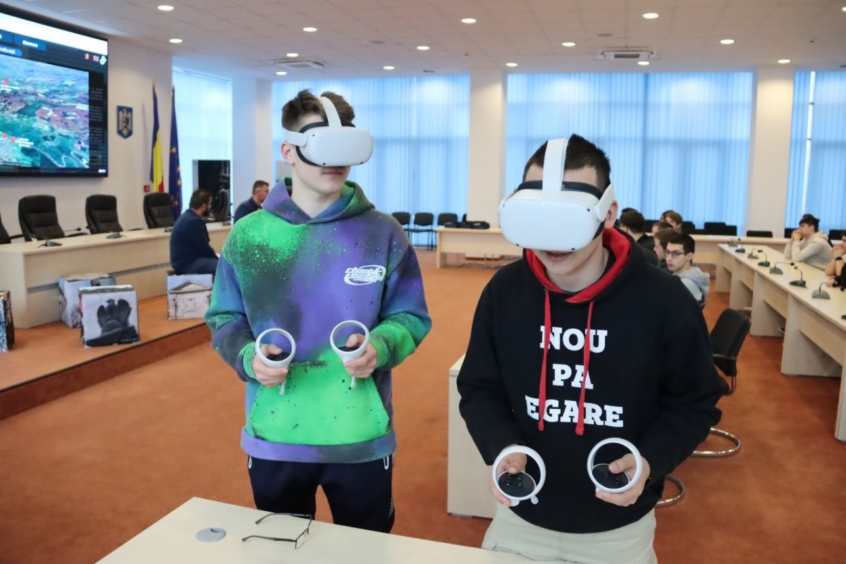 Elevii și profesorii însoțitori, Mihai Burcău și Izabela Voian, au vizitat, cu ochelarii de realitate virtuală, cele 50 de obiective turistice digitalizate de Consiliul Județean Arad.
