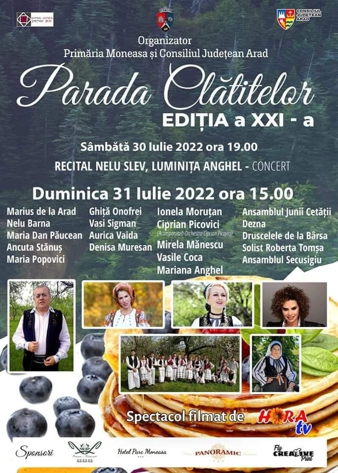 Cea de-a XXI-a ediție a binecunoscutului eveniment „Parada Clătitelor” va avea loc la sfârșitul acestei săptămâni, în 30 și 31 iulie, în stațiunea Moneasa. Pe lângă prepararea și degustarea clătitelor, în cadrul evenimentului vor avea loc și câteva momente artistice, pe scena Teatrului de Vară din stațiune.
